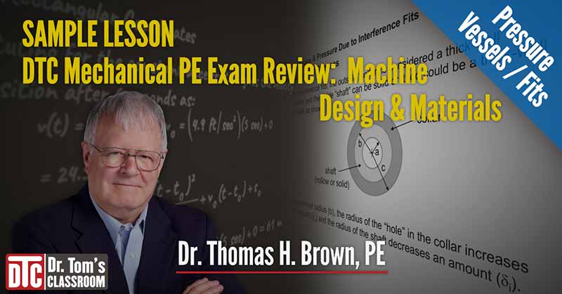 Check out Dr. Tom’s Lesson on the Pressure Vessels / Fits, which explains Fit Classifications and Pressure Due to Interference Fits from DTC’s Machine Design & Materials Mechanical PE Exam Review. You’ll see how DTC’s mechanical PE Exam prep can help you prepare for and pass the PE Exam.